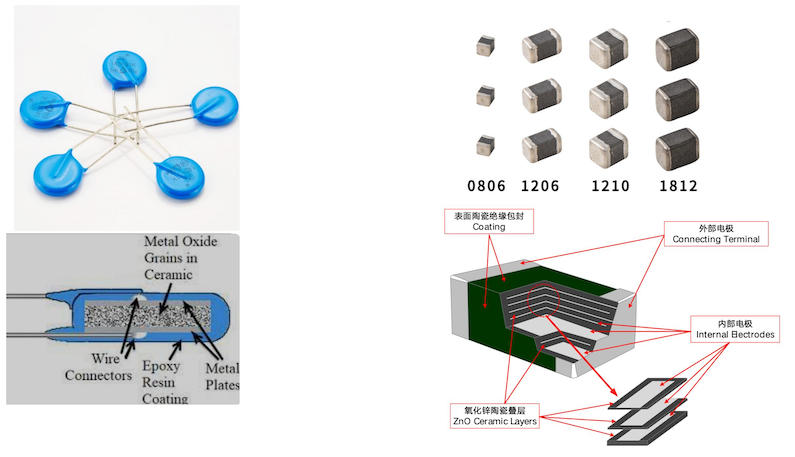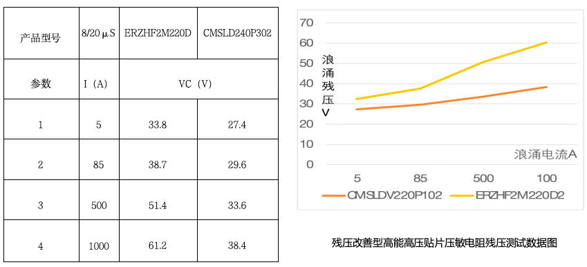 圖中分別對插腳壓敏電阻以及高能貼片壓敏電阻的結構和性能進行對比。