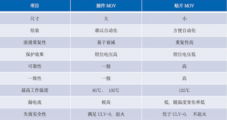 綜上所述, 需要對現有的高能貼片壓敏電阻在國際領導品牌同類產品的替代方面,在高能貼片壓敏電阻在自身固有屬性優勢的應用方面,以及新的技術趨勢的新的保護特點對高能貼片壓敏電阻的發展提出新的發展方向方面,做出有益的探討,以促進高能貼片壓敏電子行業的發展,從而促進電子行業的發展。以下就高能貼片壓敏電阻跟其他同類過壓保護器件的比較,高能貼片壓敏電阻在高電壓應用,在低電壓的應用以及在汽車電子馬達保護中對插腳壓敏的替代應用,高能貼片壓敏電阻跟隨新技術發展,在 PD 快充和汽車拋負載應用,以及失效開路產品開發方面做出探討。