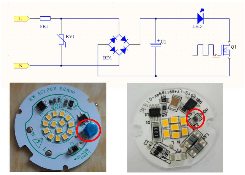 高能貼片壓敏電阻的出現,成功的解決了以上的問題,下圖就是照明行業的布線原理圖和實例圖。從下圖可以看出,高能貼片壓敏電阻使得線性DOB的生產組裝變得簡單,并且使用效果和安全性得到了極大的保證。