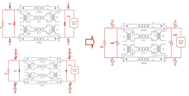 在POE中的保護,傳統是有兩種典型保護方案,一種是氣體放電管串聯插腳壓敏電阻的模式,一種是TVS的模式,他們各有優缺點,氣體放電管的模式,雖然可以做到很大的通流能力,但是保護的效果差,通常要做兩級的防護方案,所以用到的器件多,方案復雜,布線空間大,溫度的穩定性也不高。現在的方案通常是用TVS的方案,這個方案雖然一定程度上避免了第一個方案的缺點,在保護效果和布線空間上大有提升,但是溫度的穩定性仍然比較差,布線的體積仍然很大,比如在RJ45接口端的保護,TVS的體積太大就沒有辦法布線,再說TVS要達到比較高的浪涌防護能力,必須用TVS芯片疊片的方式,造價比較高。