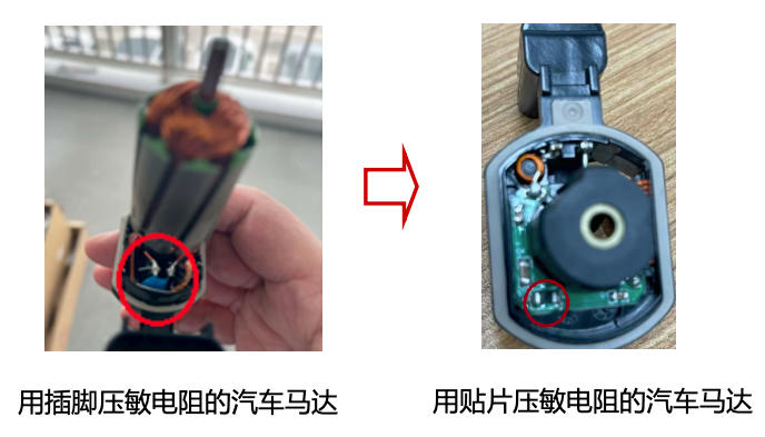 -40℃~125℃的寬溫度范圍內,各項電參數方面不能折減,甚至有的客戶提出150℃或者175℃的環境工作要求,能自然滿足該需求的就是高能貼片壓敏電阻了。在當前馬達的生產中, 消噪通常是用插腳壓敏電阻,插腳壓敏電阻最大的問題就是組裝需要手工焊接,一致性差,并且絕緣距離也不夠,而用貼片壓敏電阻,就能方便的實現自動化和有效保證絕緣距離,并且在高溫穩定性和保護的一致性方面,都優于插腳壓敏電阻。下面就是這兩種方式的比較圖片。