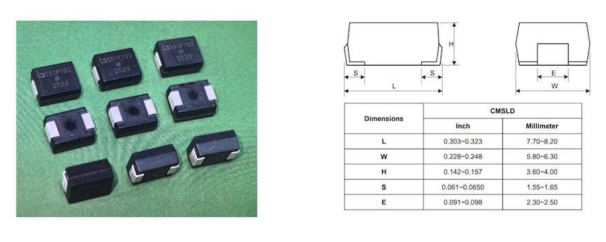 如果用低殘壓的高能貼片壓敏,就能解決這些頭疼的問題。一個方面就是高能貼片壓敏電阻本來就是小體積大通流的產品,所以一顆同樣體積的產品,可以替代3顆甚至6顆TVS管,并且沒有多顆TVS管并聯的誤差匹配問題,也就是工程師所謂的“肩膀”問題,如果能同時降低高能貼片壓敏電阻的殘壓問題,就可以使用低耐壓的MOS管,并且減少了布線的面積,從而降低了設計的成本,同時也減少了失效的風險。 下圖比較了CMSL產品跟大功率TVS的尺寸對比。