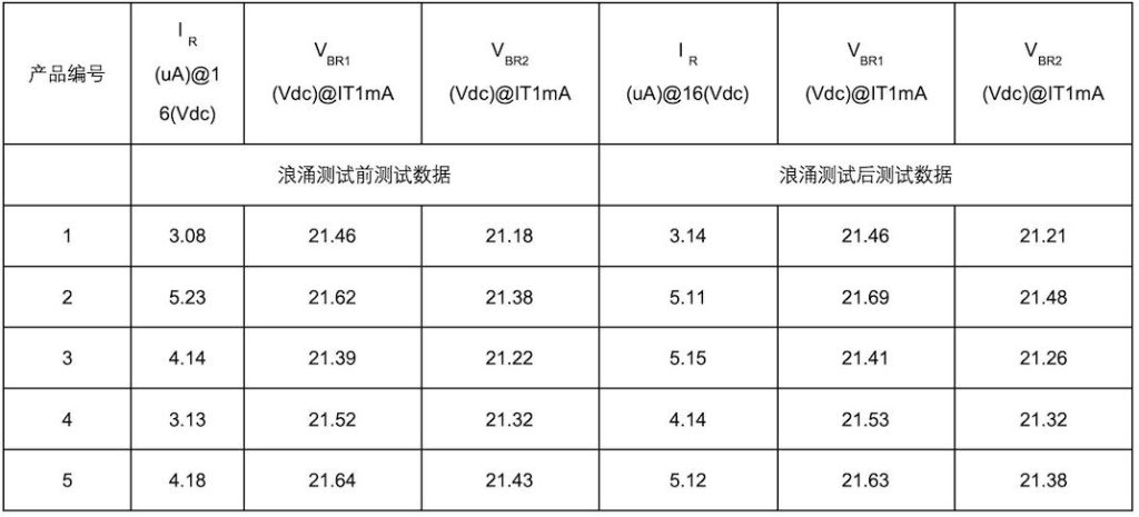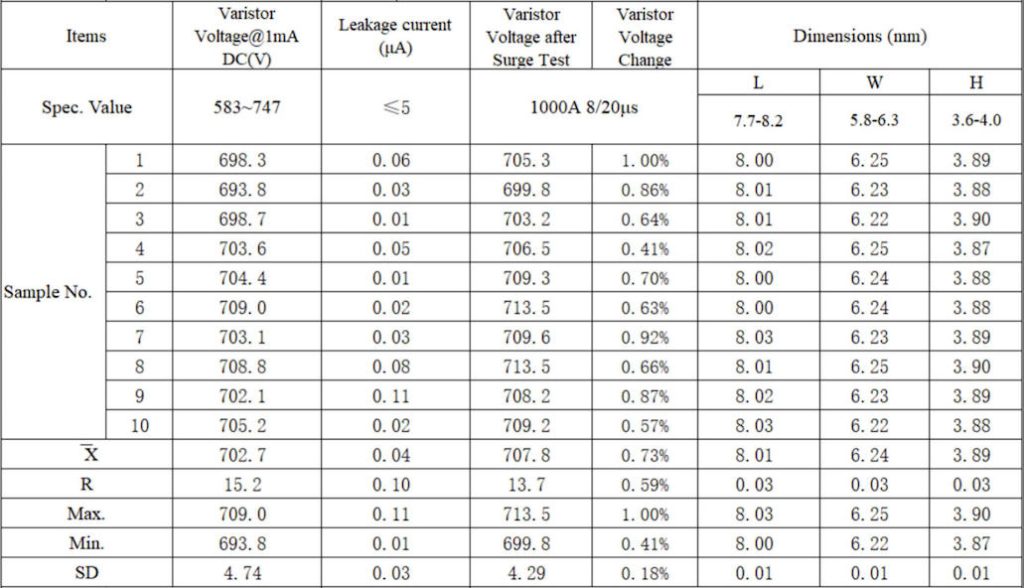從常規參數的測試數據看, 1mA下的擊穿電壓在700V左右,能滿足兩倍的工作電壓耐壓440VAC的耐壓測試,在550V直流條件下,漏電流小于5 μA 。在浪涌防護能力方面,可以通過8/20 μ s 1KA的測試,滿足客戶希望的1.5KV 750A的要求,在殘壓上,在浪涌波形8/20 μ s沖擊下,2000V浪涌的殘壓不超過800V,可以滿足客戶對1.5KV浪涌沖擊下殘壓的測試要求。具體的測試數據見下表。