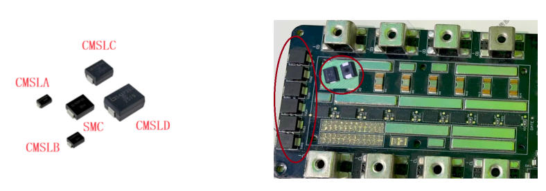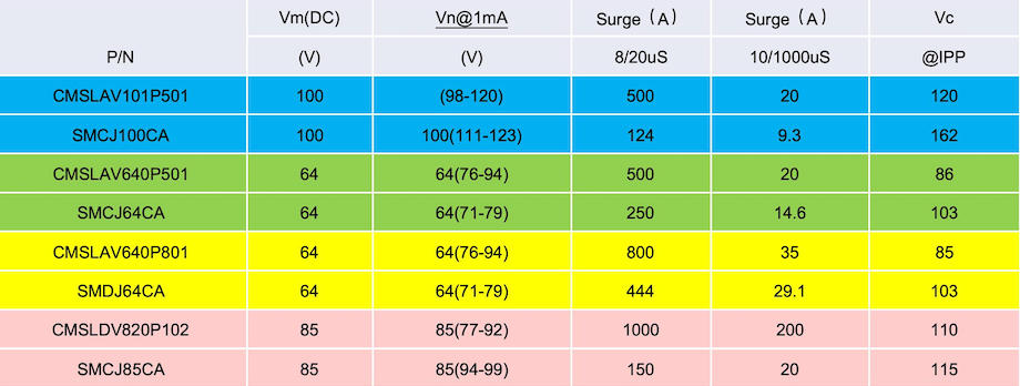 從下表的測試數據可以看出,一顆SMA封裝尺寸的CMSLAV101P501,可以通過8/20us 500A 的通流,而殘壓只有120V,作為對比,一顆SMCJ100CA的TVS,通流只有124V,殘壓162V。考慮到BMS的充放電的MOS管保護中,波形更接近于10/1000us的波形, 以及實測中,TVS管也留有足夠的余量,所以一顆CMSLAV101P501可以對超過1顆的TVS SMCJ100CA(功率5KW)的替代。同樣,用一顆CMSLD820P102 可以對SMCJ85CA的產品進行超過6顆的替代。