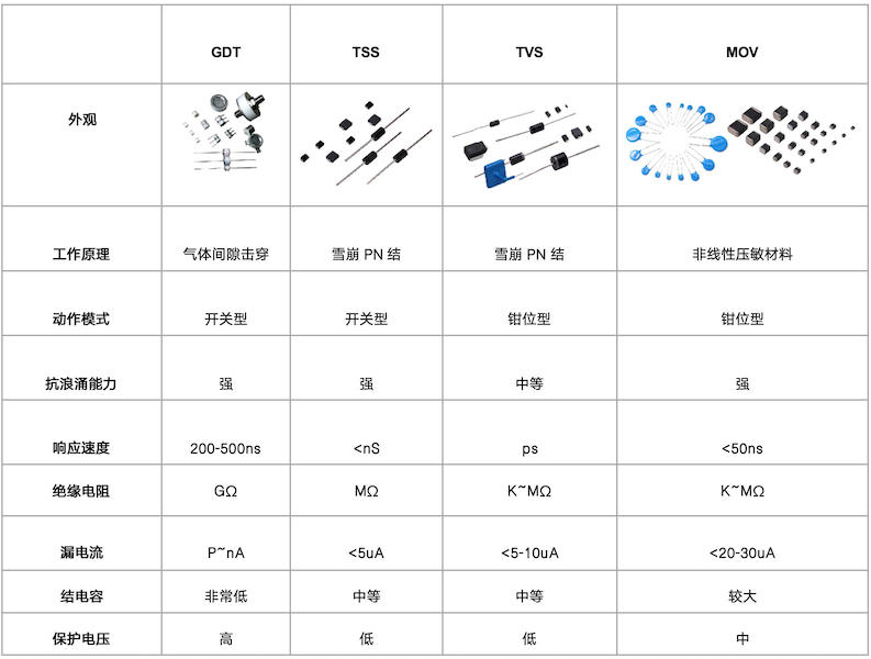 從更細分的電氣特性來說,這些開關型器件和鉗位型器件,根據產品本身的屬性和應用的特點,各有優勢和適合的應用場合,下圖是對這些產品的一個對比說明。